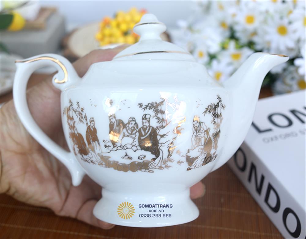 Bộ ấm chén Bát Tràng giá rẻ này được chế tác hoàn toàn thủ công tại làng gốm Bát Tràng – nơi nổi tiếng với hàng trăm năm lịch sử làm gốm. Bộ sản phẩm bao gồm một ấm trà lớn, sáu chén uống trà kèm đĩa lót, tất cả đều được vẽ họa tiết mạ vàng tỉ mỉ.ấm chén Bát Tràng giá rẻ