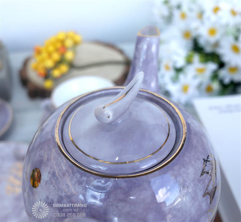 Điểm nổi bật trên thân ấm chén Bát Tràng men hỏa biến là họa tiết hoa sen vẽ vàng nổi bật trên nền tím hỏa biến. Đây là hình ảnh trong phong thủy tượng trưng cho sự thanh tịnh, phú quý và tâm hồn cao đẹp. Những chi tiết vàng được vẽ thủ công vô cùng tinh xảo, thể hiện rõ đẳng cấp của bộ ấm chén mạ vàng Bát Tràng.ấm chén Bát Tràng men hỏa biến