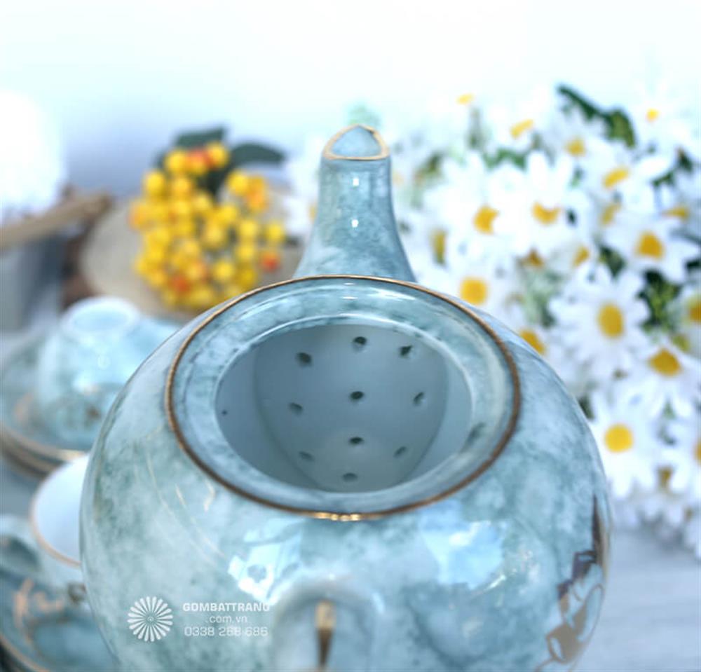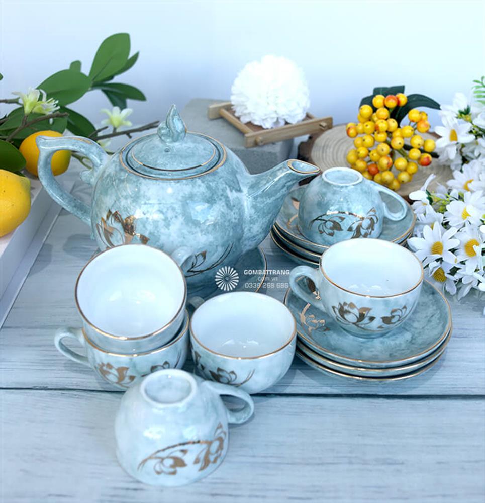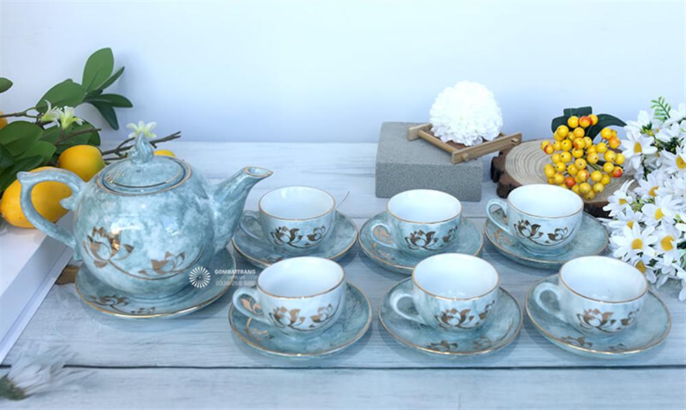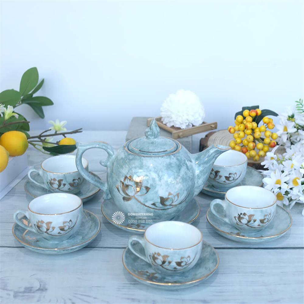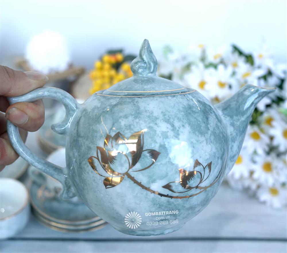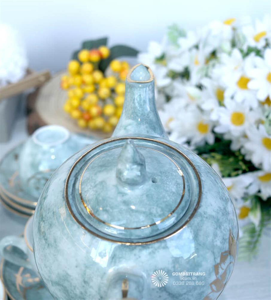 Sự kết hợp giữa họa tiết hoa sen mạ vàng và lớp men xanh nhạt giúp ấm chén gốm Bát Tràng không chỉ là dụng cụ thưởng trà mà còn là vật phẩm trang trí đầy nghệ thuật.Ấm chén gốm Bát Tràng