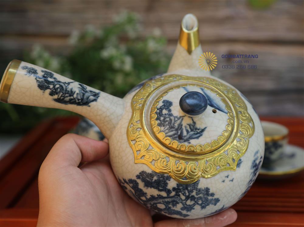 Ấm chén men rạn từ lâu đã là biểu tượng của sự trang nhã, thanh lịch trong văn hóa thưởng trà Việt. Bộ ấm chén men rạn sơn thủy lam cổ với dáng quai chuôi sang trọng chính là sự kết hợp hoàn hảo giữa vẻ đẹp cổ điển và tinh thần tinh tế của nghệ thuật gốm Bát Tràng.
