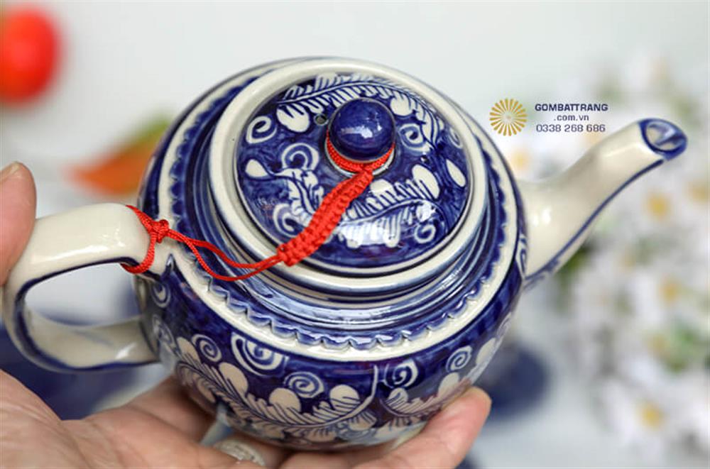 Ấm chén pha trà Bát Tràng nổi bật với ấm trà có thiết kế dáng tròn cổ điển. Màu xanh lam đặc trưng của Bát Tràng tạo nên nét thanh lịch, quý phái cho sản phẩm. Vòi rót cong mềm mại, nắp ấm có núm cầm hình búp sen tinh tế, mọi chi tiết đều được chăm chút tỉ mỉ.ấm chén pha trà Bát Tràng