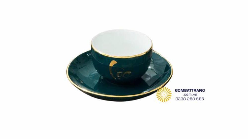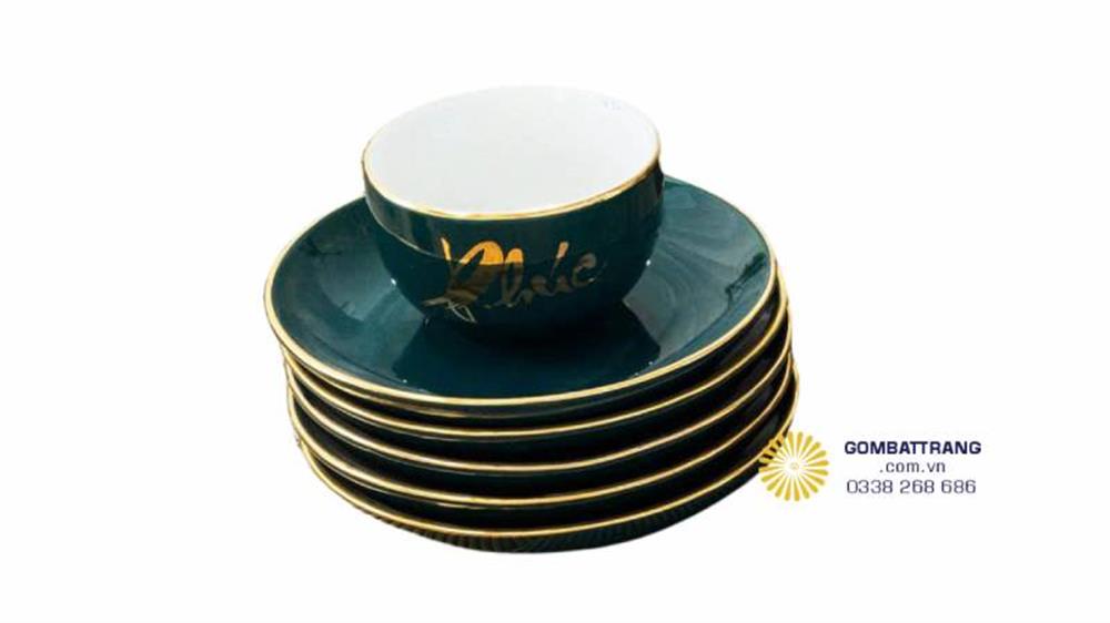 Đường chỉ vàng 24K chạy dọc miệng chén và vành đĩa lót, nung ở nhiệt độ 1300°C, tạo khung viền bền màu, xa hoa và hoàn toàn an toàn cho người dùng