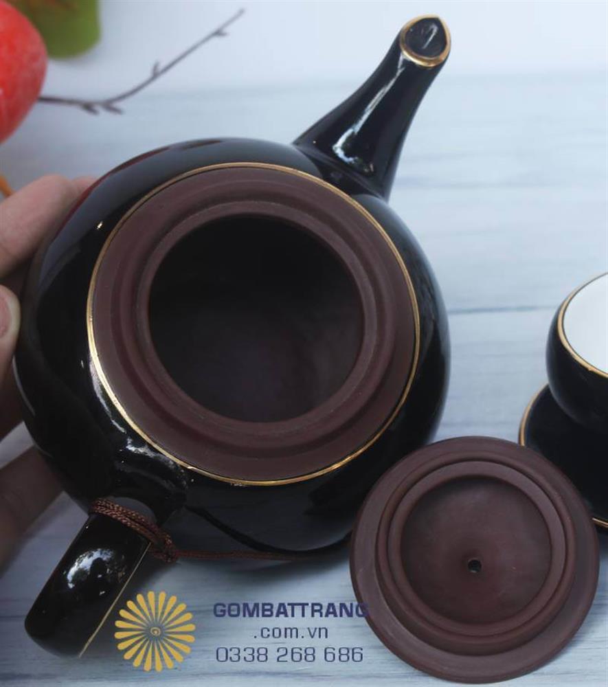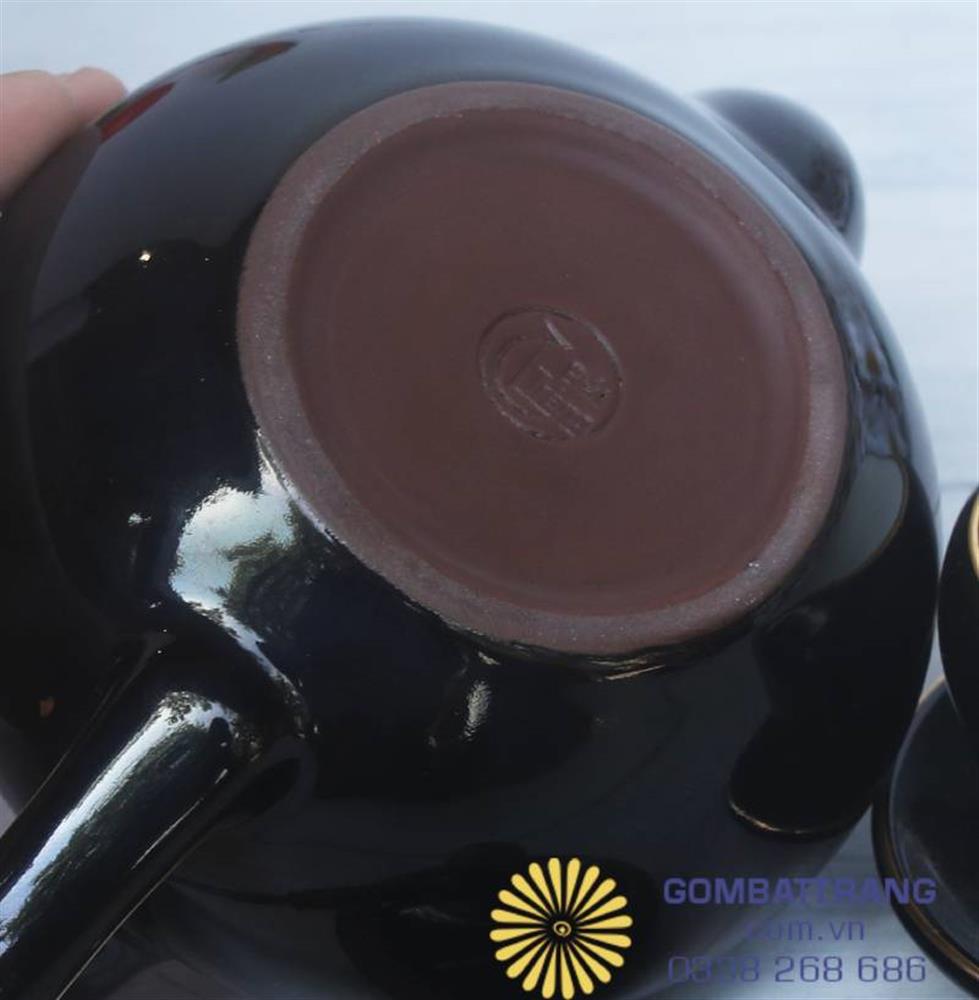 Phần đáy của bộ ấm chén được làm từ chất gốm nâu mịn, chắc chắn, mang lại cảm giác bền vững và sang trọng. Ở giữa in dấu nổi tinh xảo, như minh chứng cho nguồn gốc chuẩn mực của gốm Bát Tràng, vừa là điểm nhấn thẩm mỹ vừa khẳng định giá trị thương hiệu