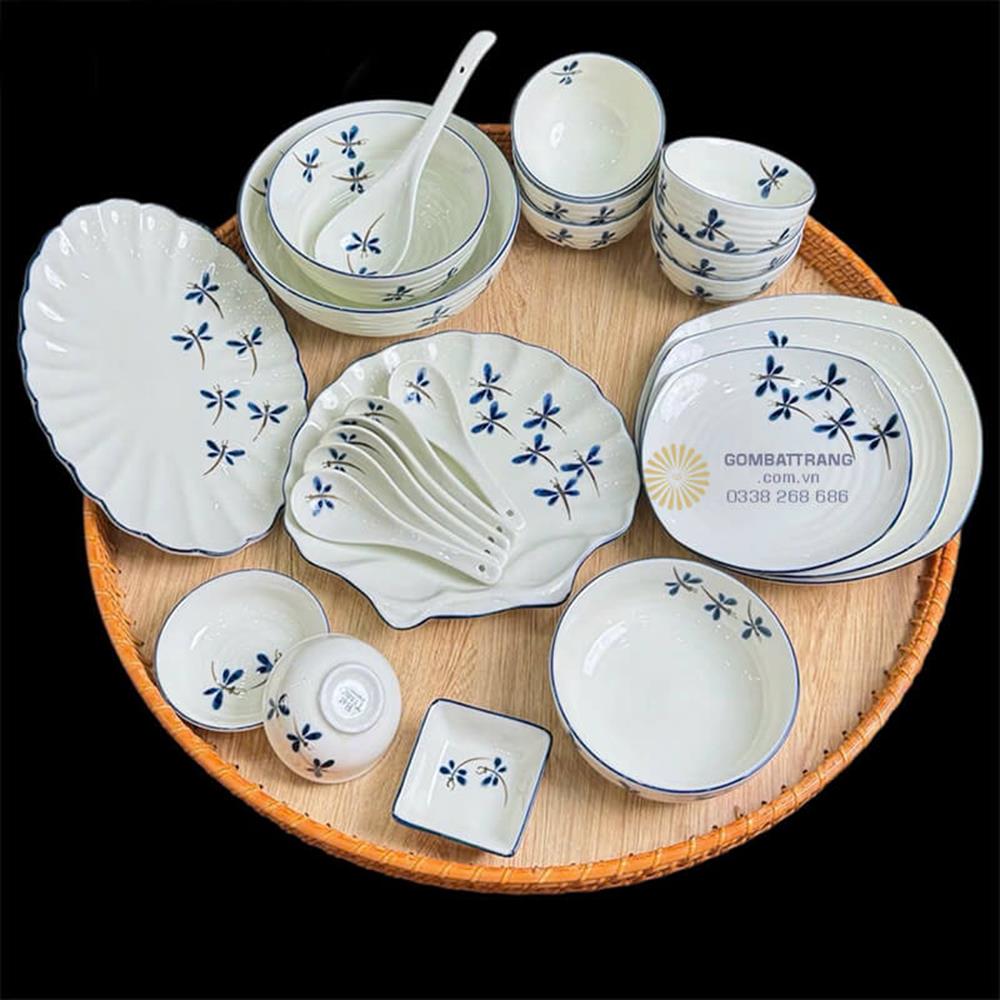 Bộ bát đĩa đẹp bát tràng vẽ chuồn chuồn bao gồm đầy đủ phụ kiện tiện dụng cho bữa ăn gia đình. Với đầy đủ các loại bát, đĩa, tô, thìa, bộ bát đĩa đẹp bát tràng này đáp ứng trọn vẹn nhu cầu sử dụng trong gia đình từ bữa cơm thường ngày đến tiệc đãi khách.bát đĩa bát tràng cao cấp