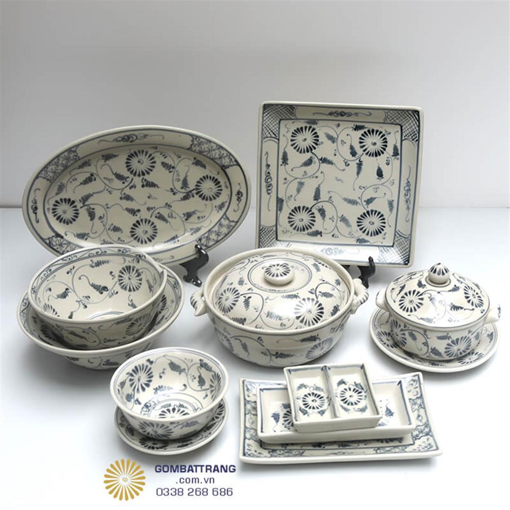 Hoa cúc - biểu tượng của sự trường thọ và tinh thần bất khuất - được đặt ở vị trí trung tâm mỗi sản phẩm, bao quanh bởi dây leo mềm mại tượng trưng cho sự kết nối bền chặt trong gia đình.bát đĩa bát tràng đẹp