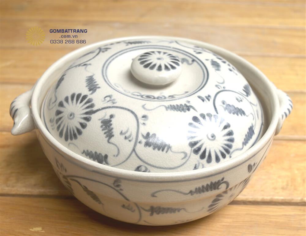 Bát tô lớn có nắp với tay cầm hai bên là phụ kiện nổi bậtt trong bộ bát đĩa bát tràng đẹp, thích hợp để đựng canh, lẩu nhỏ hoặc các món hầm truyền thống. Họa tiết hoa cúc đại đóa ở trung tâm thân tô tượng trưng cho sự viên mãn, trọn vẹn, mang ý nghĩa phong thủy cầu mong gia đình no đủ, hạnh phúc.bát đĩa bát tràng đẹp
