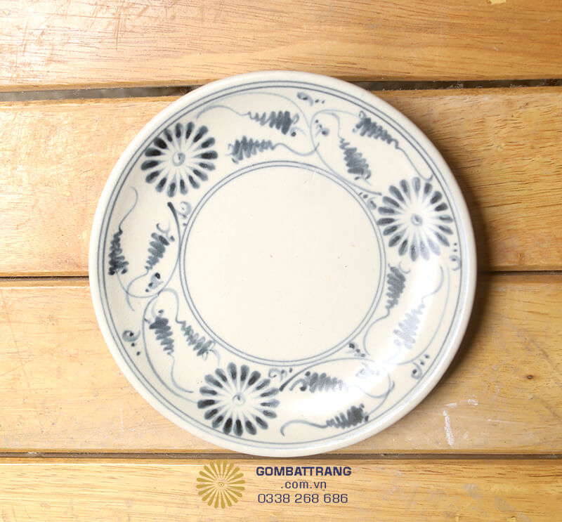 Những chiếc đĩa lớn trong bộ bát đĩa cổ xưa thường dùng để bày các món ăn chính trong mâm cỗ hoặc tiệc chiêu đãi. Bề mặt đĩa được vẽ tay tỉ mỉ với họa tiết hoa cúc mãn khai, dây leo uốn lượn. Phần viền đĩa được trang trí bằng đường diềm kẻ ô tinh xảo, gợi nhớ phong cách bát đĩa cổ xưa.