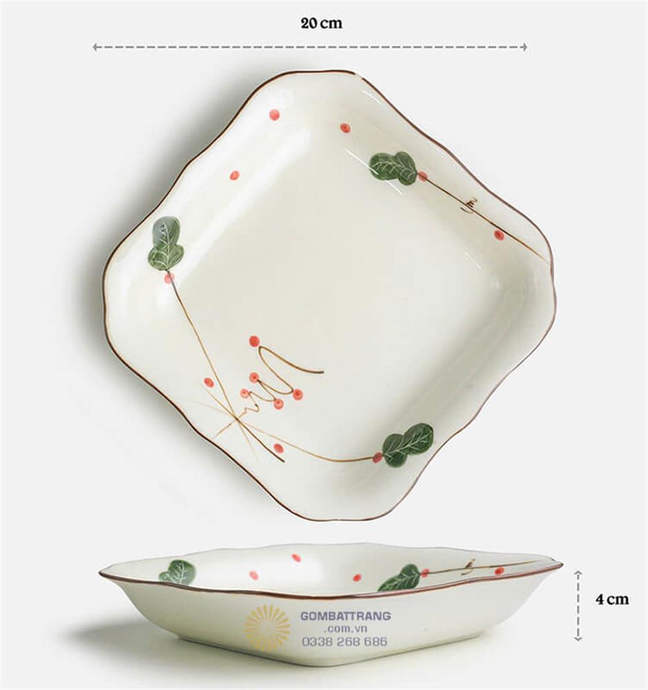 Bát đĩa bát tràng hoa xương rồng gây ấn tượng mạnh mẽ với họa tiết được vẽ tay khéo léo bởi nghệ nhân. Những chiếc lá xương rồng xanh tươi được điểm xuyết những nét chấm phá màu đỏ tinh tế, tạo nên sự tương phản hài hòa trên bề mặt sứ trắng ngà.bát đĩa bát tràng