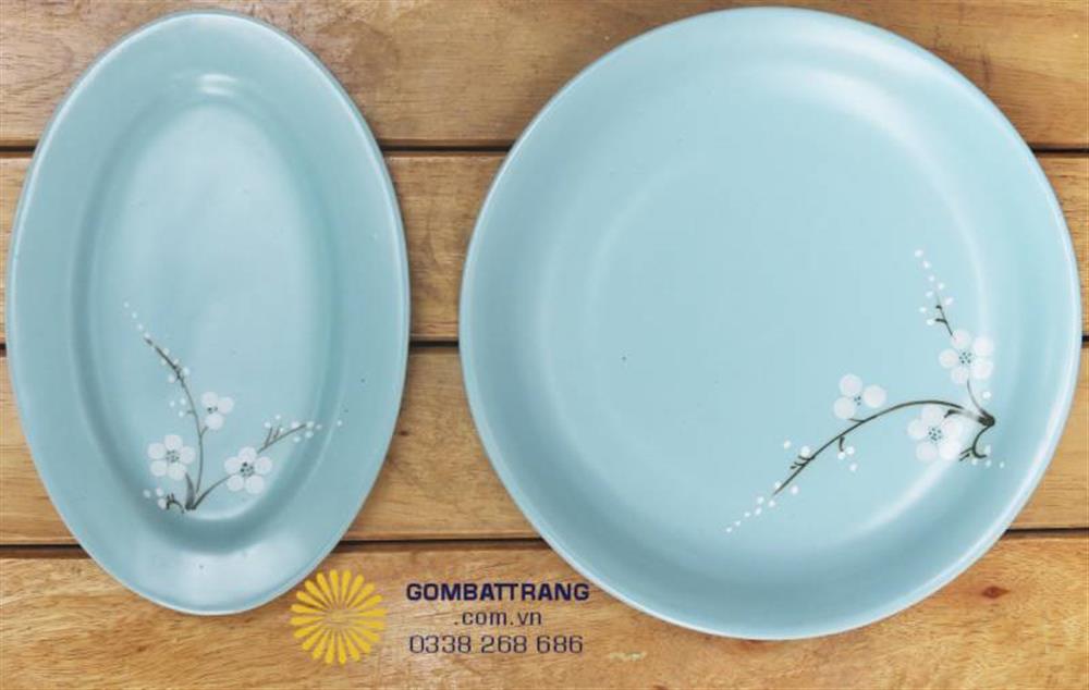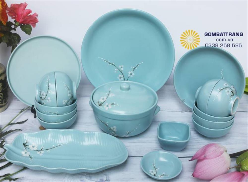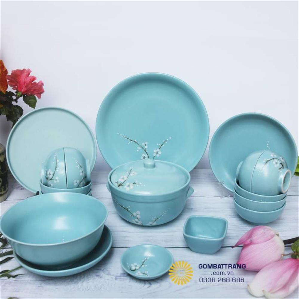 Bộ bát đĩa Bát Tràng cao cấp men xanh ngọc, hoa mai vẽ tay tinh xảo thích hợp chọn trang trí và làm quà tặng