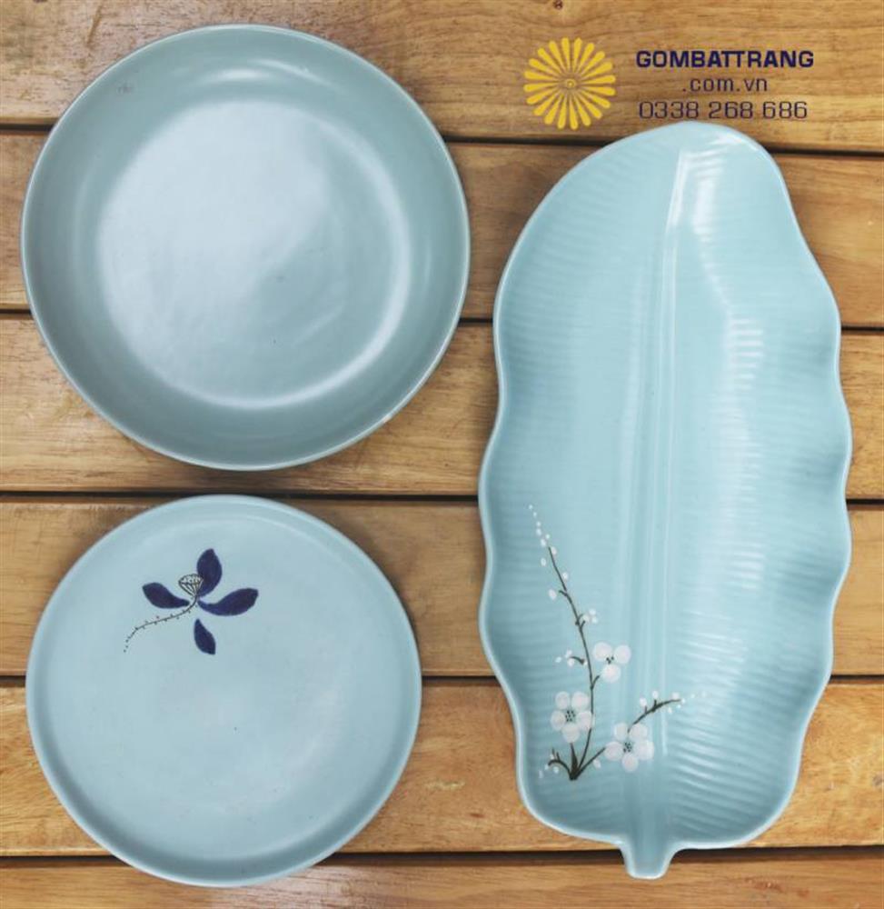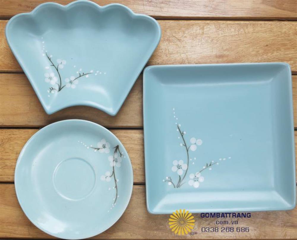 Bát đĩa Bát Tràng men xanh ngọc nung 1.200°C, hoa mai vẽ tay thủ công