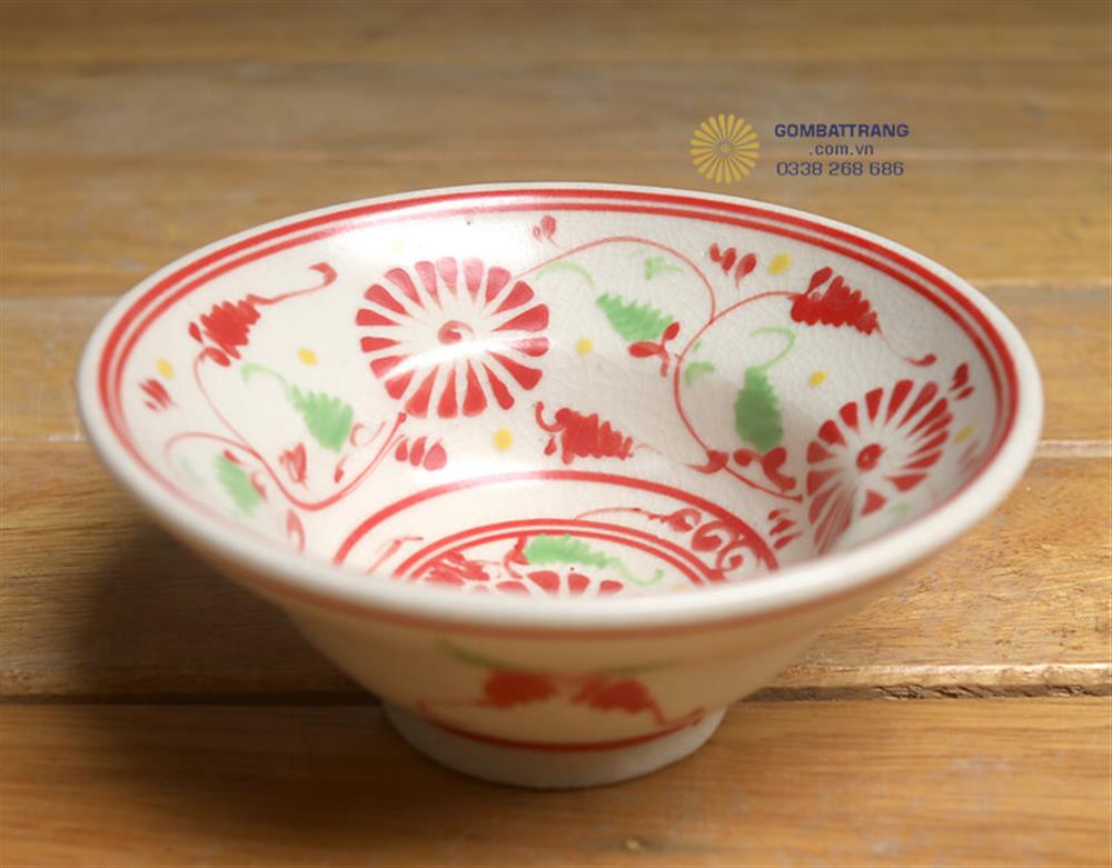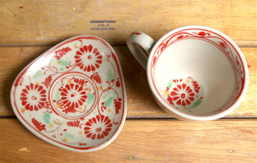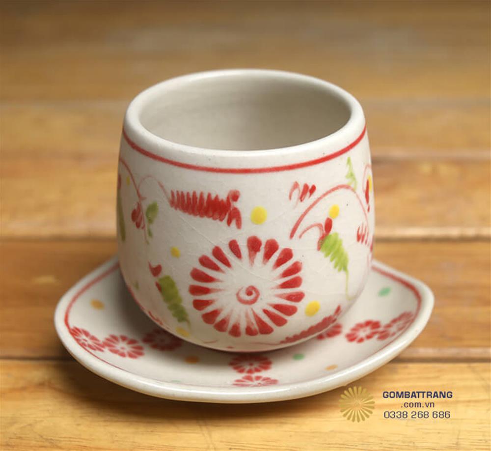 Những chén uống trà nhỏ xinh với thành chén mỏng, men trắng ngà mịn màng và họa tiết hoa đỏ thanh thoát. Đây là phụ kiện không thể thiếu trong bộ trà gốm bát đĩa bát tràng giả cổ, gợi lên nét đẹp văn hóa trà đạo thuần Việt.bát đĩa cổ