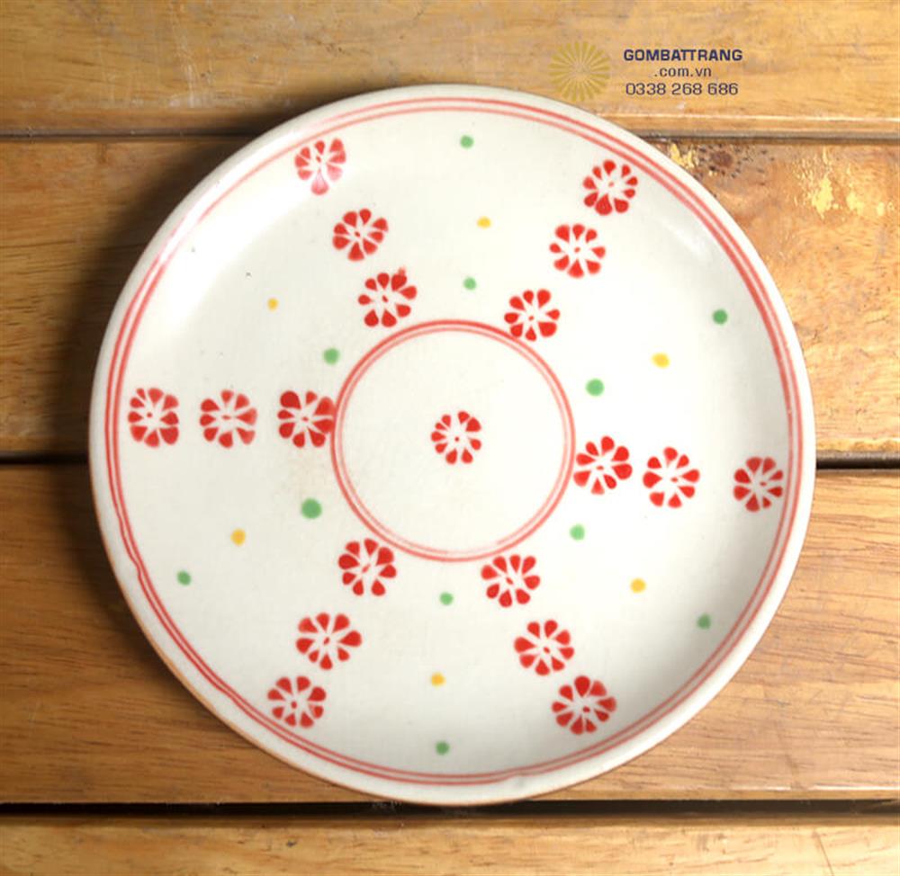 Chiếc đĩa tròn lớn với họa tiết hoa cúc đỏ bố cục đối xứng, viền chỉ đỏ mảnh là điểm nhấn sang trọng trên bàn ăn
