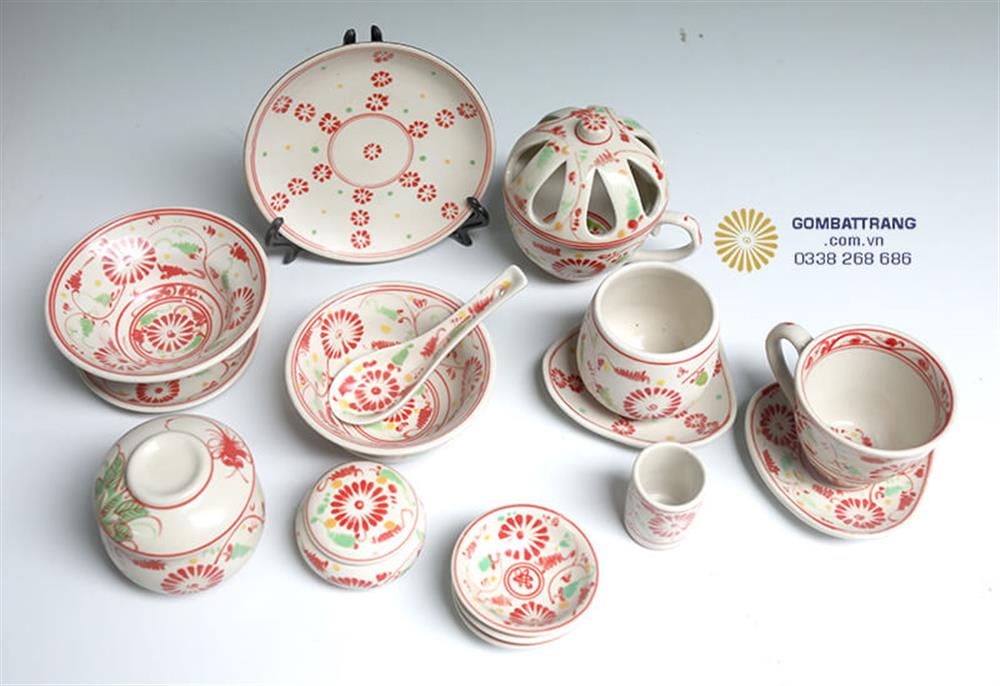 Trên thân bộ bát đĩa gốm sứ giả cổ là những bông hoa cúc màu đỏ tươi rực rỡ được vẽ tay tỉ mỉ, bao quanh bởi lá xanh thanh mảnh. Trong phong thủy, hoa cúc đỏ tượng trưng cho may mắn, thịnh vượng và tình duyên viên mãn.bát đĩa cổ