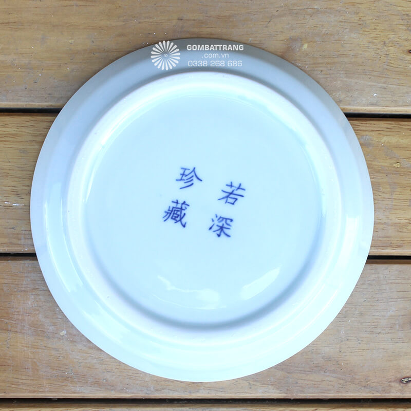 Trên mặt đĩa gốm sứ, có thể thấy rõ cảnh bảy nhân vật ngồi quây quần quanh bàn đá, xung quanh là cây tùng, non bộ và nhà thủy tạ. Những đường nét mềm mại, phối cảnh cổ điển mang lại cảm giác như đang chiêm ngưỡng một bức tranh cổ thư pháp. Đây chính là điểm nhấn nghệ thuật độc đáo của bộ bát đĩa giả cổ giá rẻ. Mặt sau đĩa gốm sứ cổ được ghi hiệu đề “Nhược Thâm Trân Tàng” bằng chữ Hán, mang ý nghĩa: vật quý được bảo tồn kỹ lưỡng nơi sâu thẳm. Đây là dấu hiệu thể hiện sự trân trọng đối với giá trị tinh thần và nghệ thuật của sản phẩm.