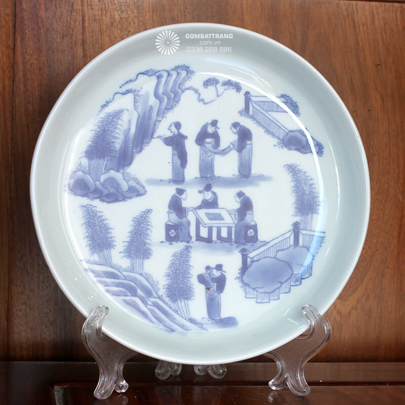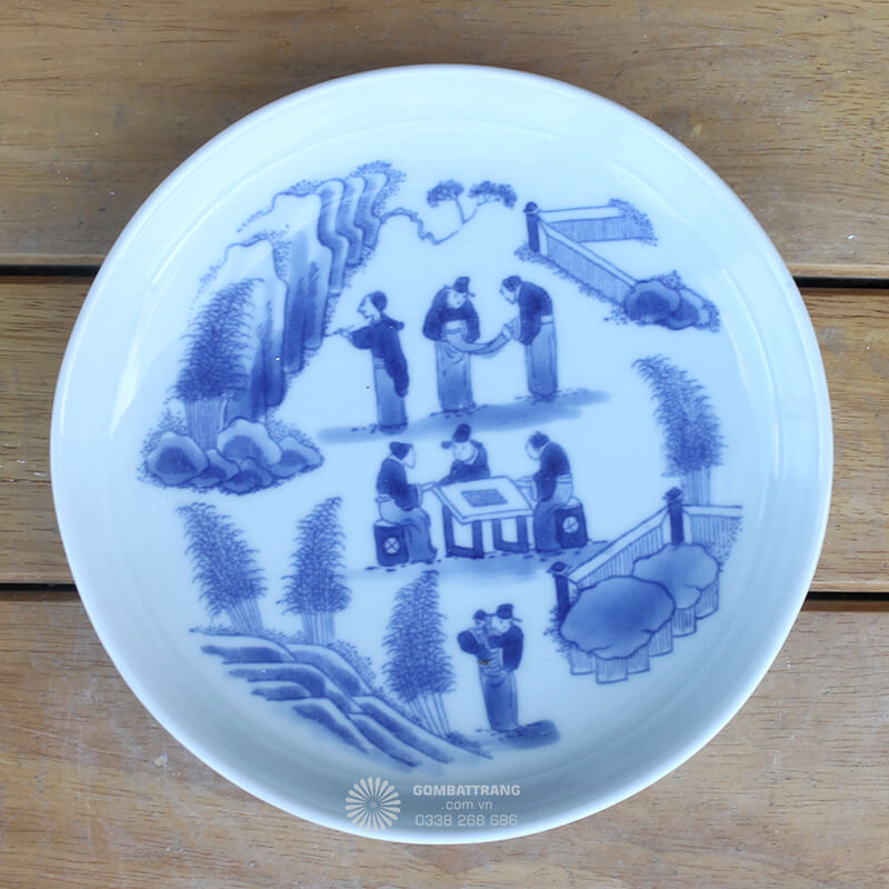Họa tiết trên mặt đĩa sứ cổ tái hiện lại cảnh sinh hoạt của nhóm Trúc Lâm Thất Hiền – bảy học giả, văn nhân, nhạc sĩ sống ẩn dật giữa rừng trúc thời Tây Tấn. Trong không gian tĩnh lặng ấy, họ trò chuyện, uống rượu, đàn hát và bàn luận về triết lý sống. Hình ảnh được vẽ thủ công với những đường nét hanh thoát, thể hiện không khí thanh cao, phóng khoáng và đầy trí tuệ.