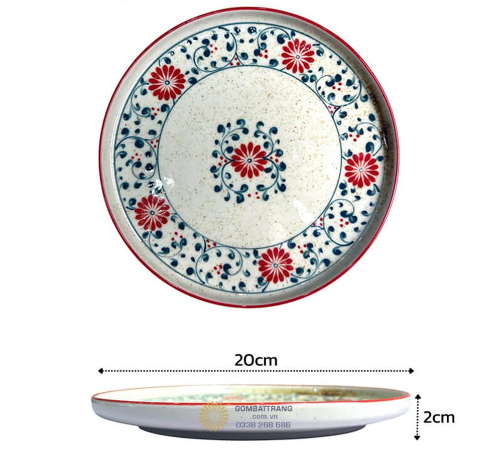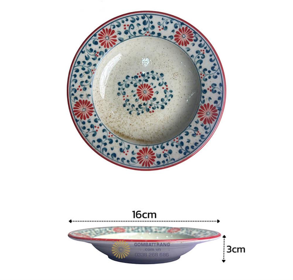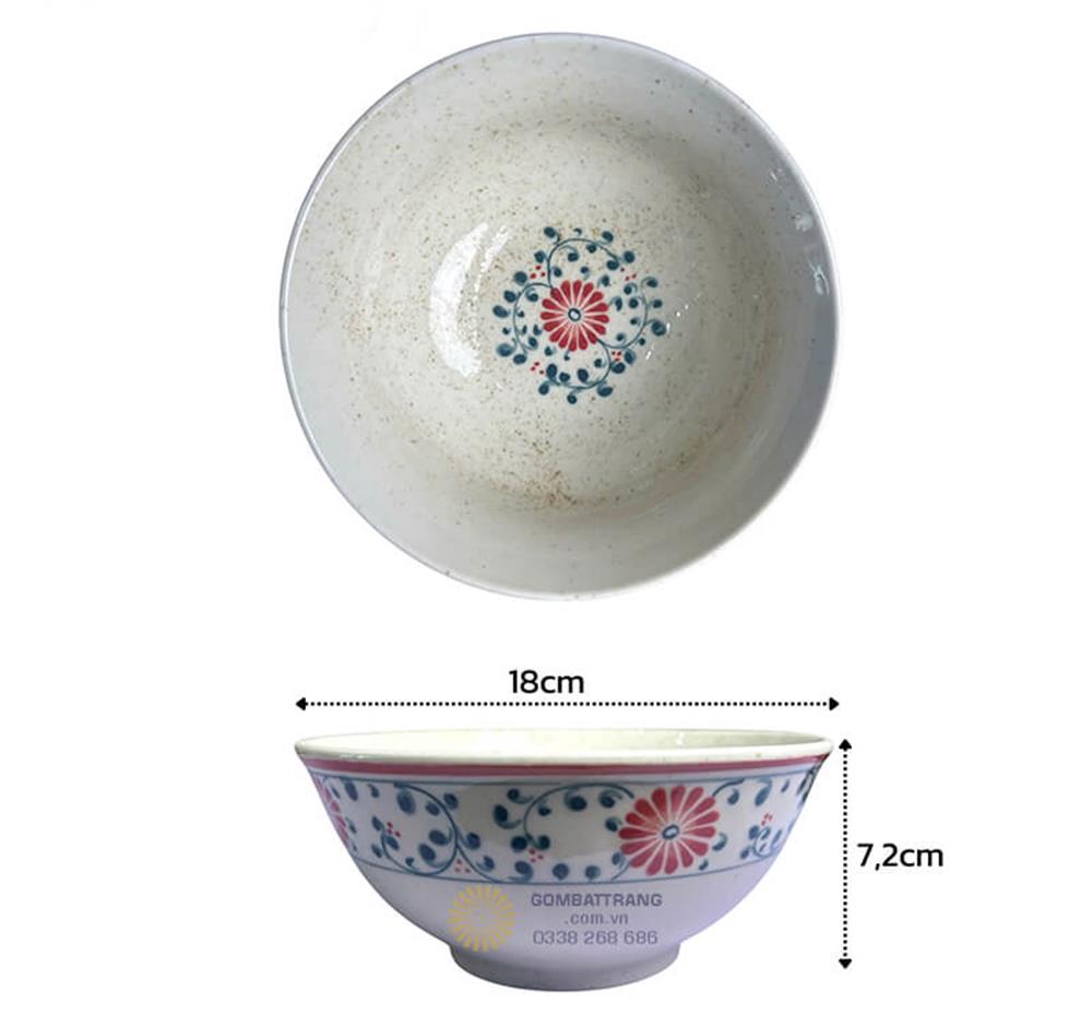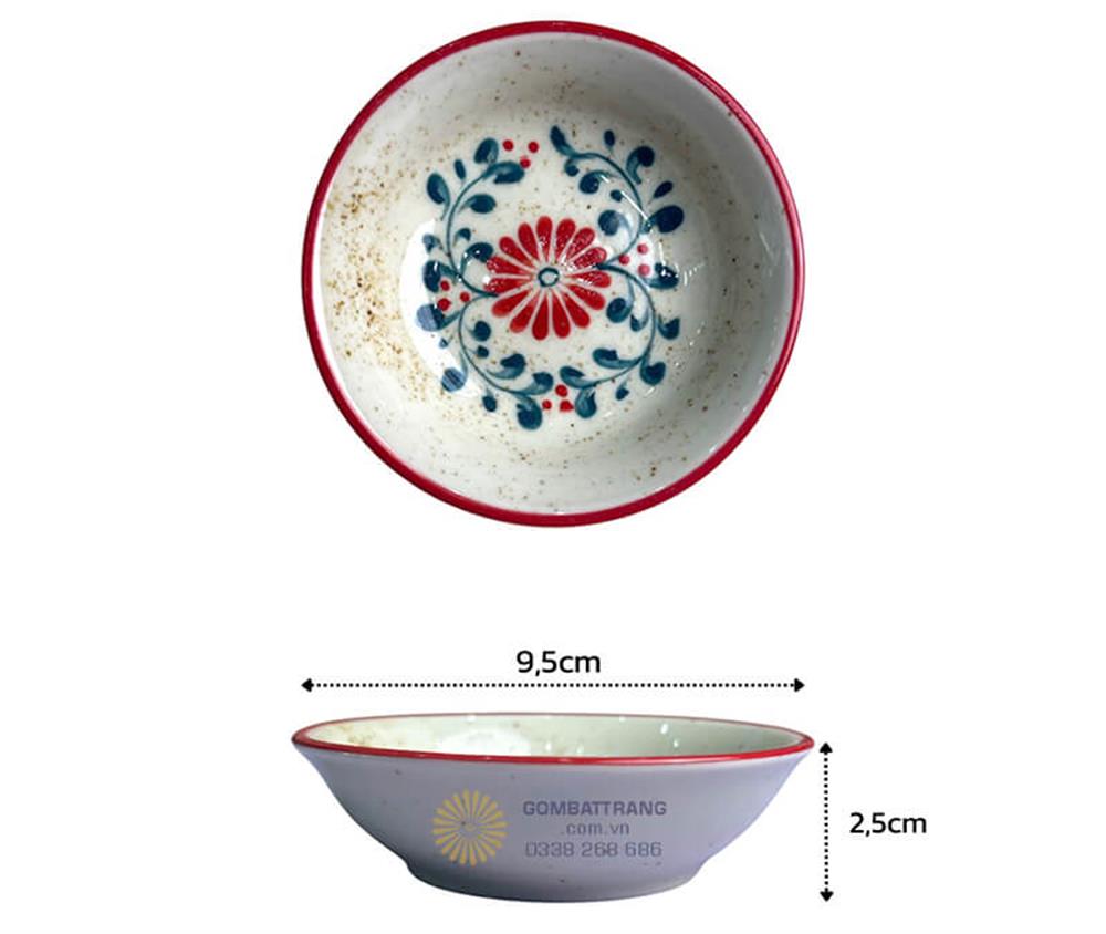 Họa tiết hoa cúc được vẽ tay tỉ mỉ với màu đỏ và xanh dương rực rỡ trên nền trắng ngà tinh khiết, tạo nên vẻ đẹp cổ điển nhưng không kém phần hiện đại. Viền đỏ tươi bao quanh từng sản phẩm như một dải lụa mềm mại, khiến bộ bát đĩa bát tràng này trở thành tâm điểm thu hút mọi ánh nhìn.