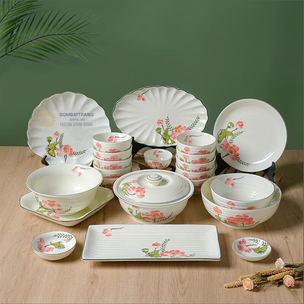 Bát đĩa gốm Bát Tràng với họa tiết hoa sen đỏ tinh xảo mang đến vẻ đẹp thanh nhã, sang trọng cho không gian bàn ăn