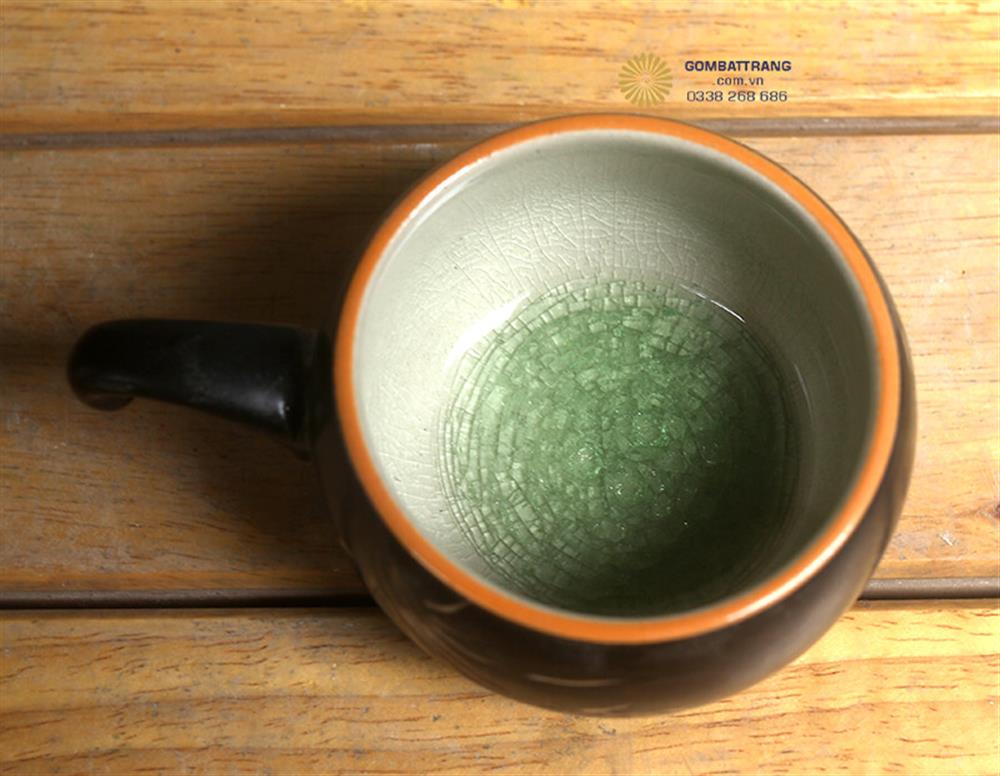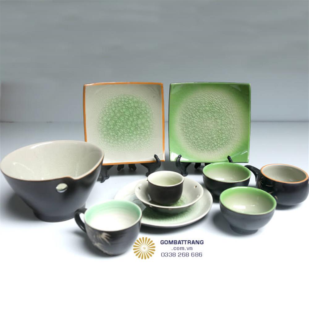 Chiếc chén có quai cũng được tạo tác một cách tỉ mỉ bằng tay nghề điêu luyện của người nghệ nhân làng gốm. Đĩa vuông với viền ngoài phủ men cam ấm áp đặc trưng và bề mặt trải đều lớp đĩa gốm men rạn xanh ngọc tinh tế. Hoa văn rạn chân chim tự nhiên tạo nên vẻ cổ kính, khiến mỗi chiếc đĩa như mang theo cả một thời gian dài lắng đọng.bát đĩa gốm thủ công