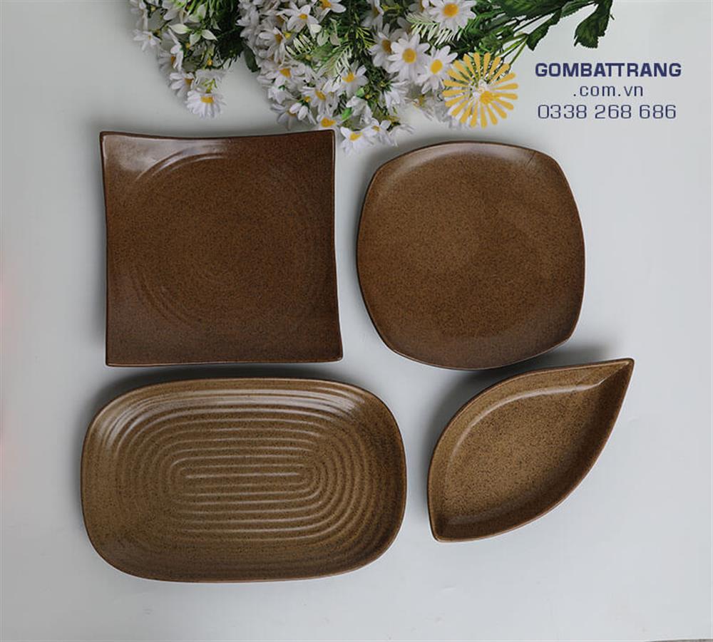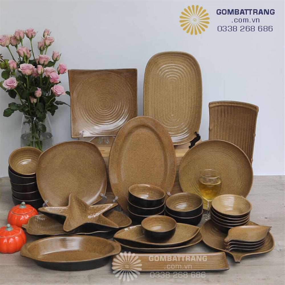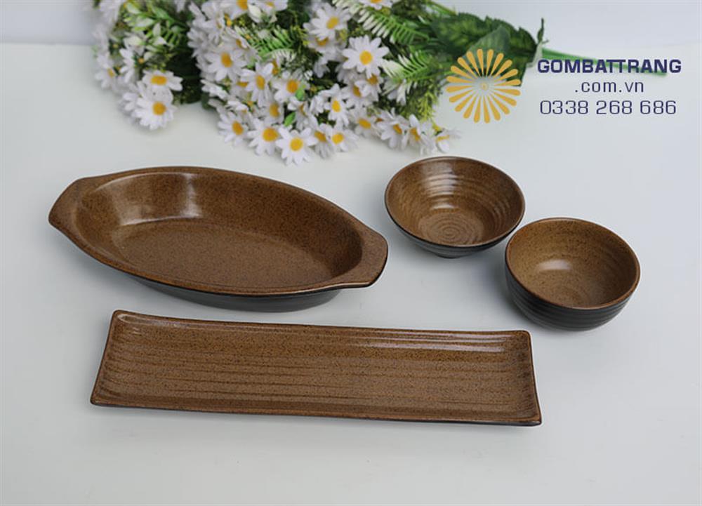 Bát đĩa nhà hàng cao cấp gốm Bát Tràng trong lòng men nâu, bên ngoài men đen sang trọng