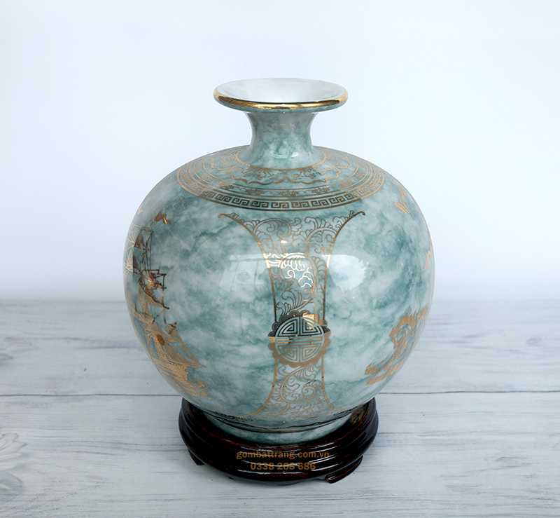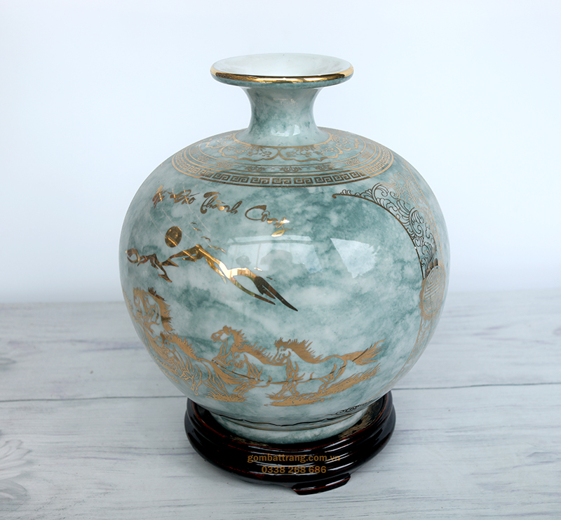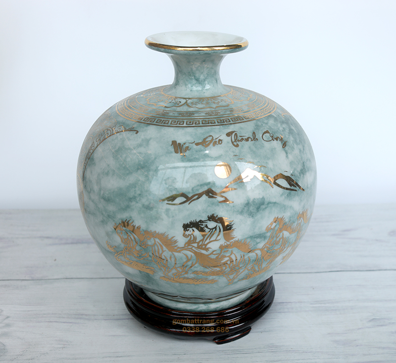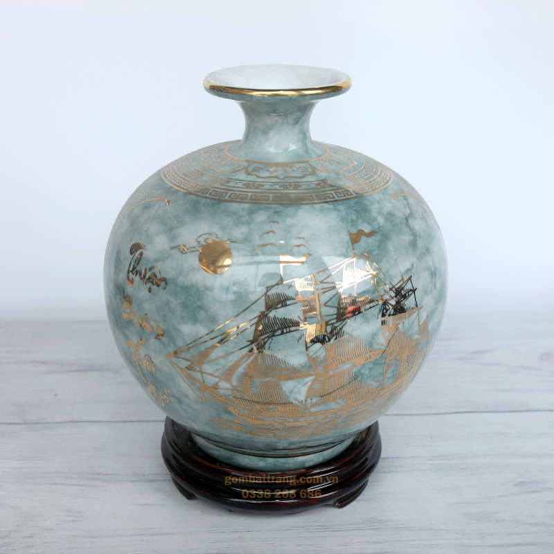 Họa tiết "Thuận buồm xuôi gió" được mạ vàng trên thân bình gốm tài lộc là biểu tượng của sự thuận lợi trong kinh doanh và sự nghiệp. Hình ảnh "Mã đáo thành công" mang ý nghĩa thăng tiến và thành công vượt bậc. bình gốm tài lộc