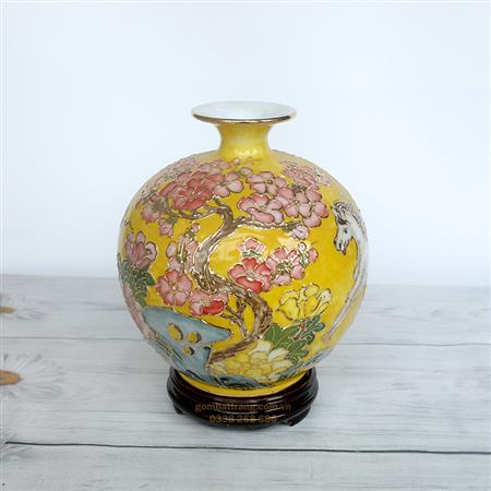 Chiếc bình gốm hút tài lộc này được làm từ chất liệu gốm sứ Bát Tràng nổi tiếng với lớp men bóng mịn màu vàng sang trọng. Họa tiết "Mã Đáo Thành Công" kết hợp cùng hoa đào được vẽ vàng tinh xảo, biểu trưng cho sự thành công, may mắn và phú quý.bình sứ hút tài lộc