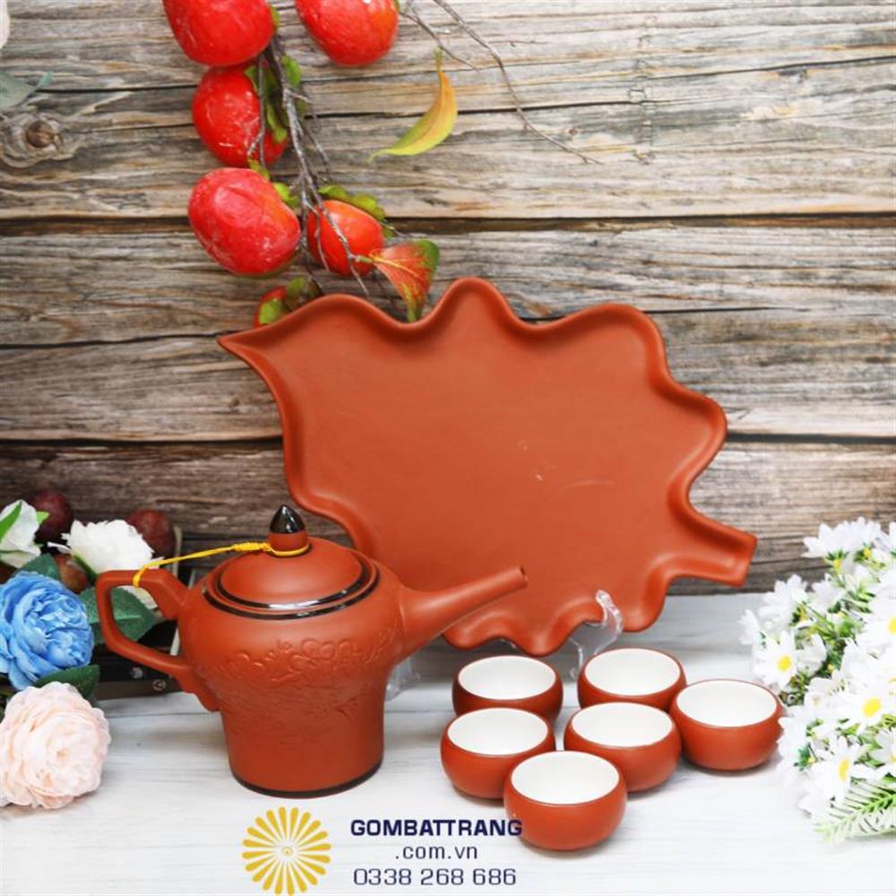 Bộ ấm chén gốm Bát Tràng này gồm một ấm, sáu chén và khay gốm dáng lá, tất cả hòa quyện trong cùng tông đỏ đất tự nhiên. Khay gốm được tạo hình như chiếc lá lớn uốn lượn, với viền cong tự nhiên và bề mặt phẳng mịn, giúp nâng đỡ trọn vẹn bộ trà mà không phá vỡ bố cục.