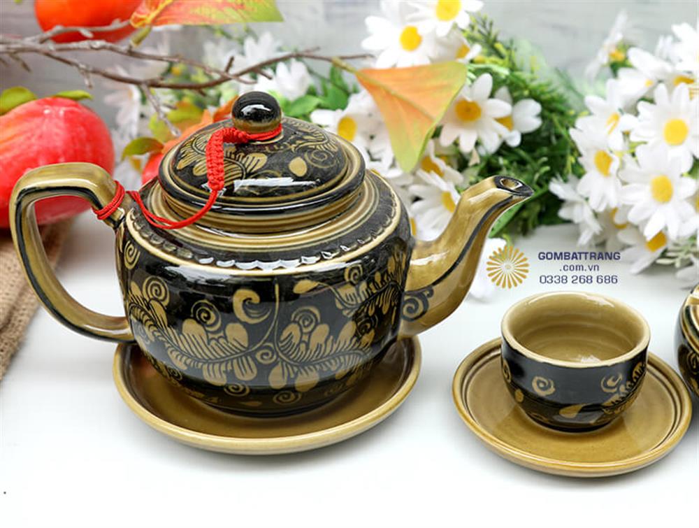 Màu sắc đen nâu kết hợp vàng kim tạo nên sự tương phản hài hòa, vừa cổ kính vừa hiện đại. Chất liệu gốm sứ Bát Tràng cao cấp được nung ở nhiệt độ cao đảm bảo độ bền vượt trội và an toàn sức khỏe.Bộ ấm chén Bát Tràng giá rẻ
