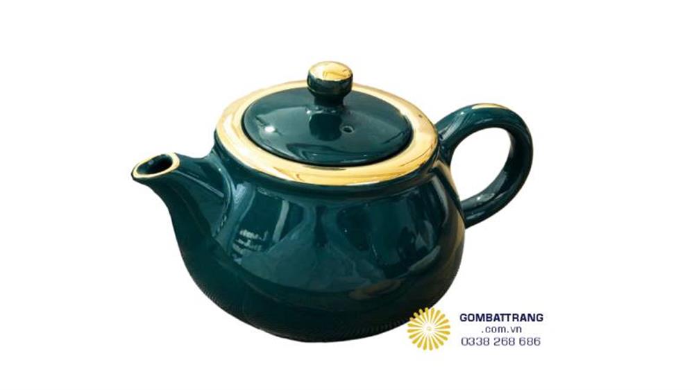 Một đường chỉ vàng chạy quanh miệng chén — mảnh, sắc, đều như kẻ bằng chỉ tơ. Đó không chỉ là điểm nhấn trang trí; nó là ranh giới giữa hai thế giới: bên ngoài là sắc xanh trầm tĩnh của men, bên trong là lòng chén trắng tinh khôi. bộ ấm chén đẹp cao cấp