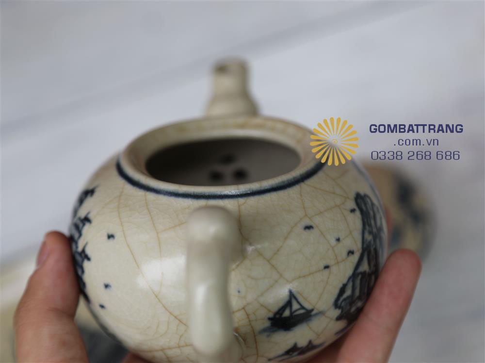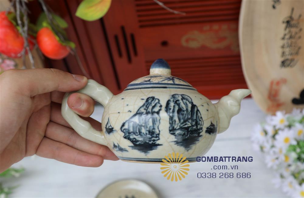Bộ ấm chén đẹp sang trọng lấy cảm hứng từ cảnh sắc Vịnh Hạ Long – di sản kỳ quan thiên nhiên thế giới. Những nét vẽ tay mô tả núi đá, sóng nước, thuyền buồm tạo nên vẻ đẹp nghệ thuật đặc trưng mà ít bộ trà nào có được. Chính sự hài hòa giữa phong cảnh Việt và chất men rạn cổ tạo nên giá trị nổi bật.