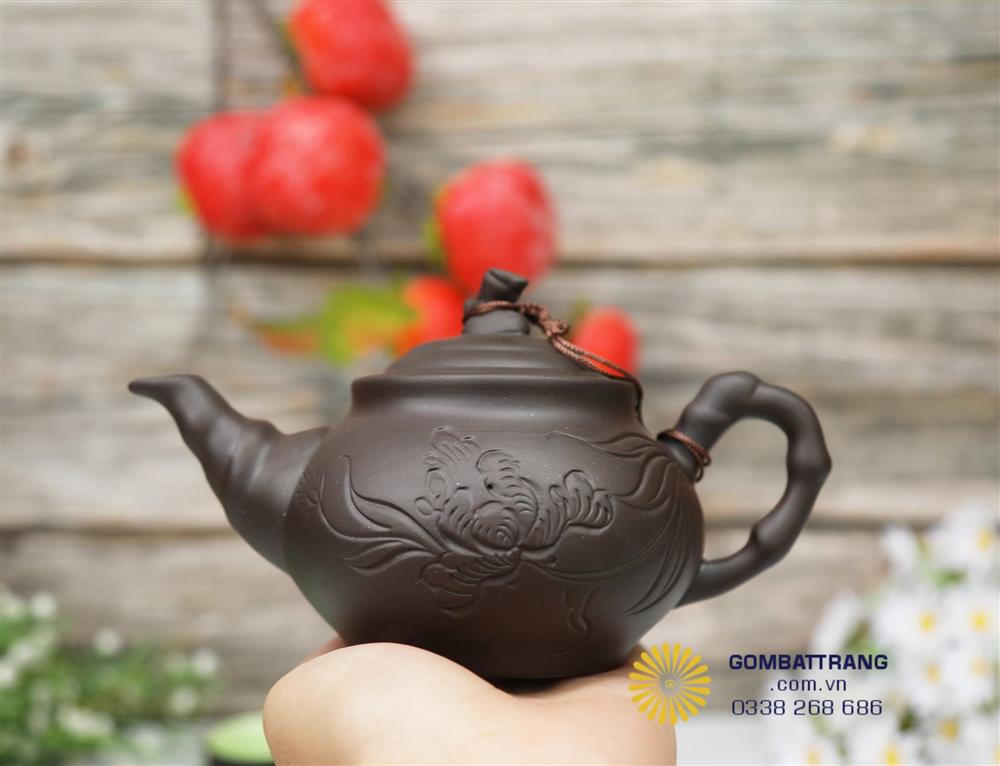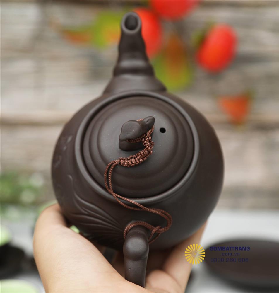 Tổng thể bộ ấm chén nổi bật nhờ dáng ấm tròn căng, quai uốn cong mềm tựa nhành sen, tạo cảm giác thanh thoát nhưng vẫn vững chãi. Đường khắc nổi trên thân ấm được tạo khối sâu – sắc nét và đồng nhất đến từng nét chạm.