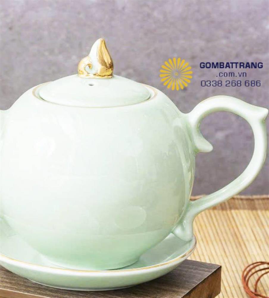 Nhưng chi tiết đáng giá nhất nằm ở núm nắp – được tạo hình như ngọn lửa vàng nhỏ, phủ men ánh kim sang trọng. Đây chính là điểm sáng nổi bật nhất của bộ trà chính hãng Bát Tràng: trên nền xanh ngọc dịu, ngọn vàng ấy bừng lên như ánh lửa sự sống.
