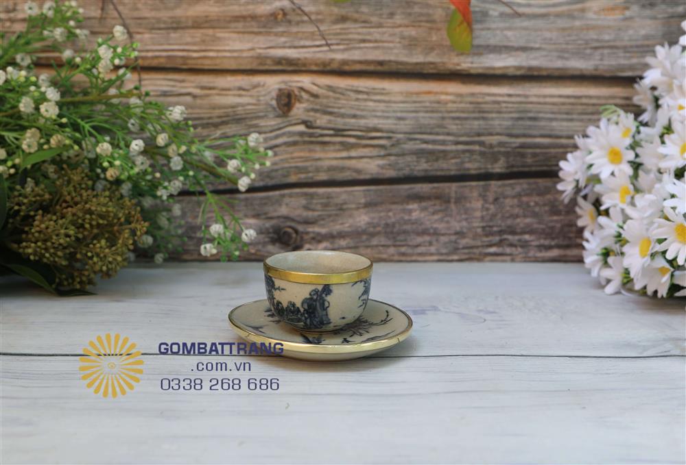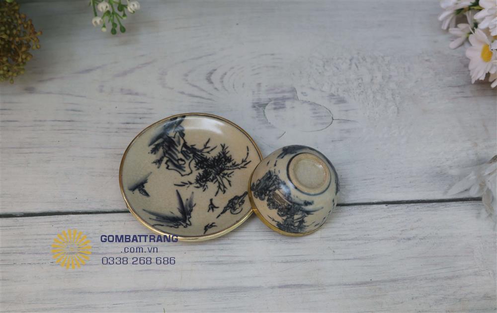 Đĩa lót chén men rạn Bát Tràng đồng bộ họa tiết lam cổ, giúp bộ trà thêm cân đối và đẳng cấp