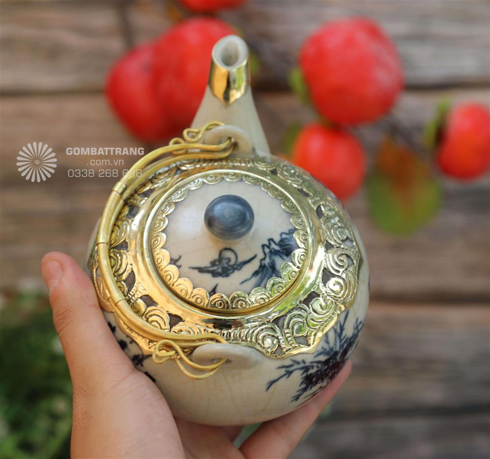 Ấm trà men rạn Bát Tràng dáng cổ bọc đồng sang trọng, vẽ tay họa tiết Trúc Lâm Thất Hiền tinh xảo
