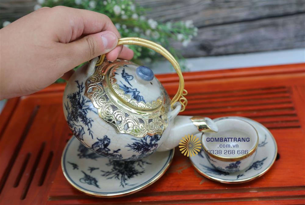 Trong dòng sản phẩm trà cụ truyền thống, ấm chén men rạn Bát Tràng luôn là biểu tượng của sự tinh xảo và sang trọng. Bộ ấm chén men rạn cổ bọc đồng họa tiết Trúc Lâm Thất Hiền không chỉ mang giá trị thẩm mỹ cao mà còn chứa đựng chiều sâu văn hóa và tinh thần thanh tao của người Việt yêu trà.