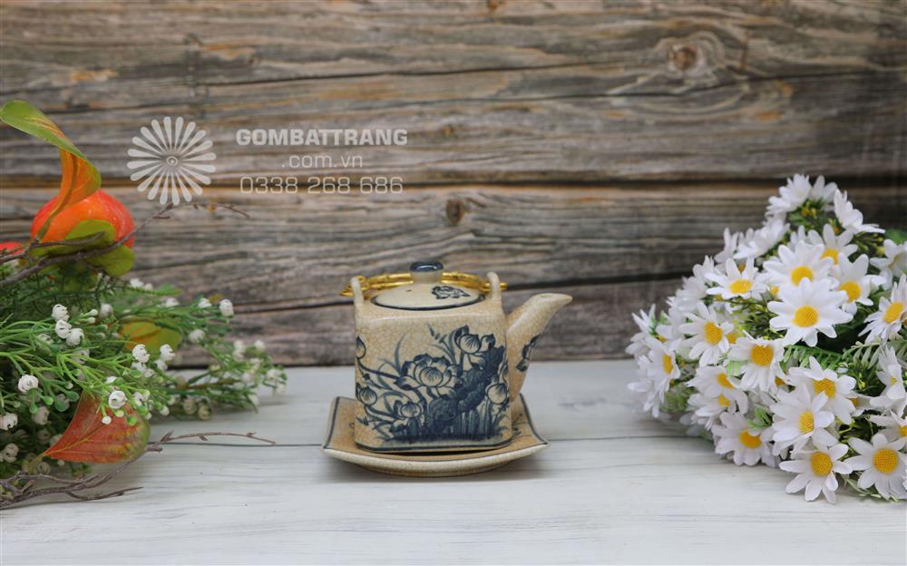 Ấm trà men rạn cổ vẽ hoa sen thân vuông cổ điển, tay cầm chắc chắn, họa tiết sen vẽ tay tinh xảo