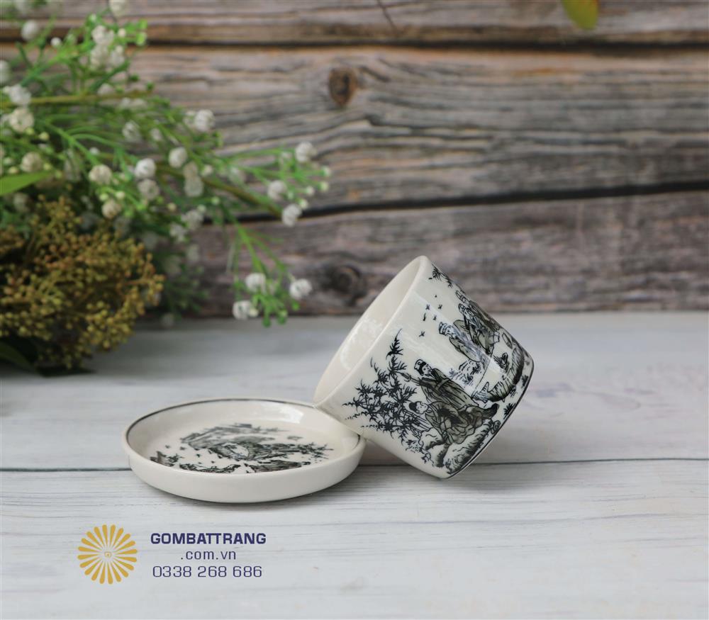 Họa tiết Trúc Lâm Thất Hiền được vẽ hoàn toàn bằng tay, thể hiện tinh thần “ẩn dật – thanh tịnh – tự do”, tôn vinh phong cách sống tao nhã của người Việt xưa. Đây chính là điểm nhấn giúp bộ trà vượt khỏi khuôn khổ vật dụng thông thường, trở thành tác phẩm gốm sứ có giá trị sưu tầm cao.