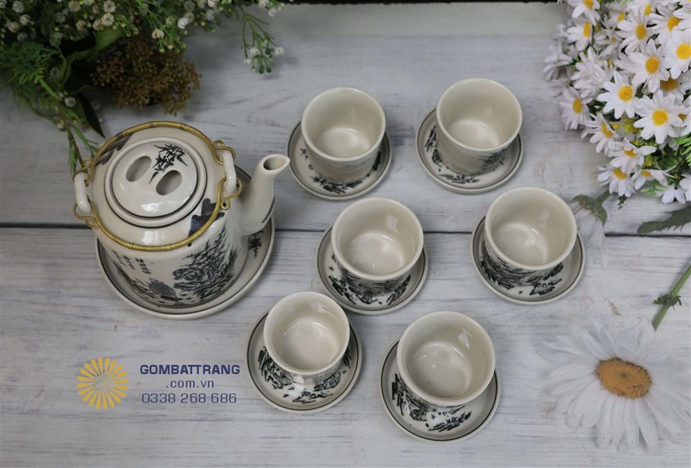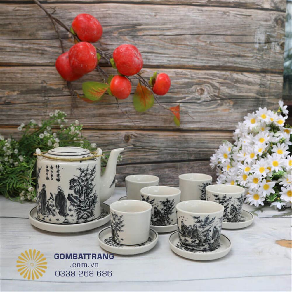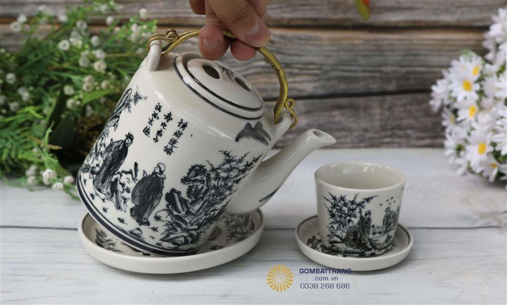 Bộ ấm chén nghệ nhân Bát Tràng họa tiết Trúc Lâm độc đáo