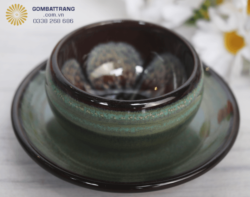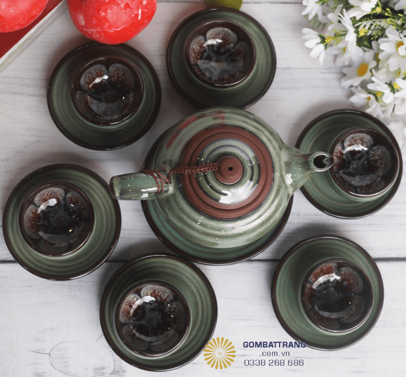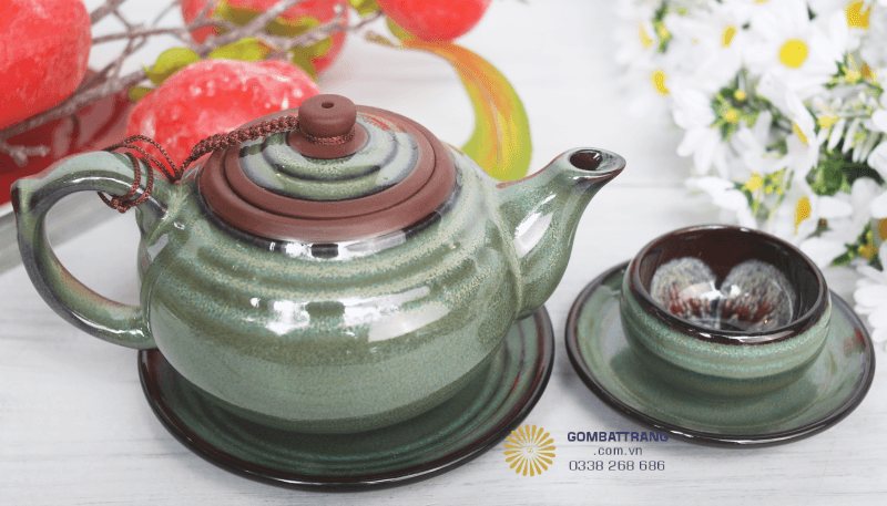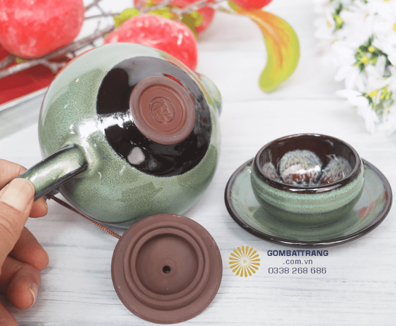 Bộ ấm chén tử sa Bát Tràng được tráng men từ những nguyên liệu hoàn toàn tự nhiên giúp ấm chén có mầu sắc tươi mới mịn màng nhưng đanh chắc