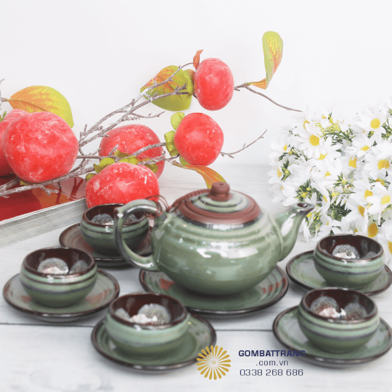 Bộ ấm chén từ sa Bát Tràng, đắp nỏi quả cau, khắc chìm hoa văn tinh tế, chén men xanh đẹp