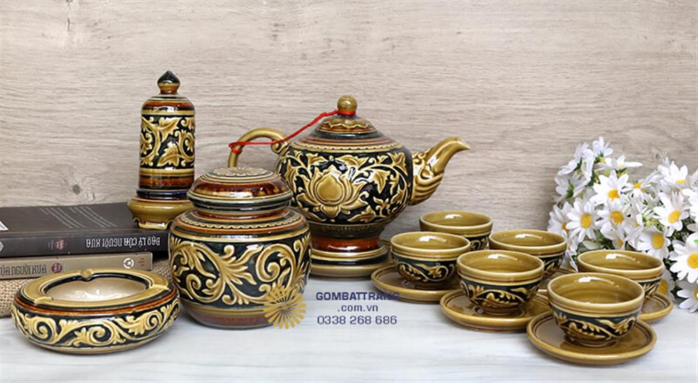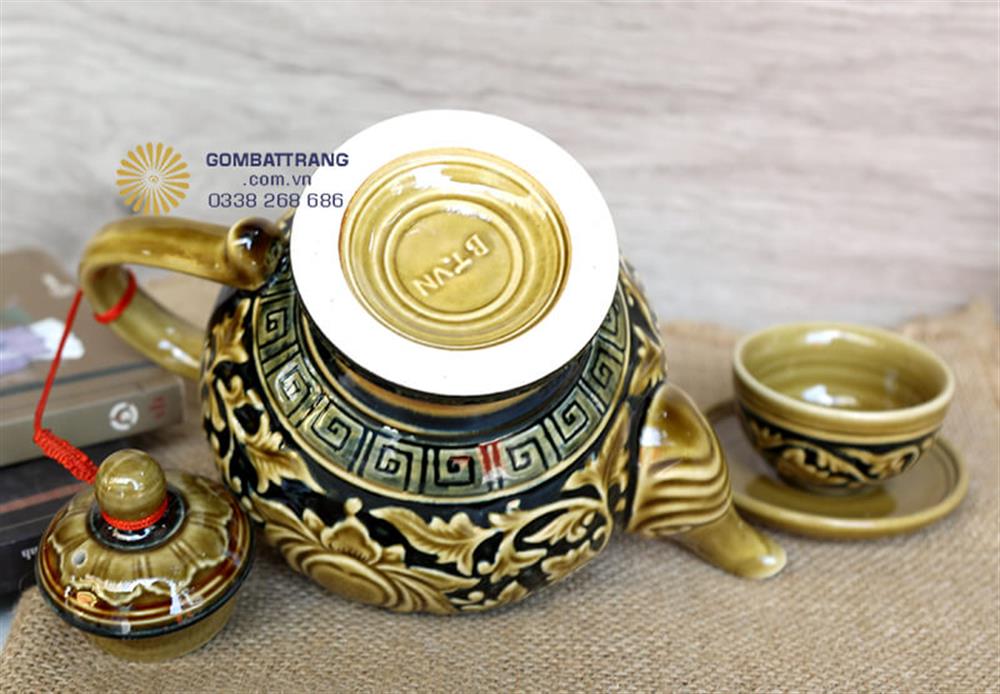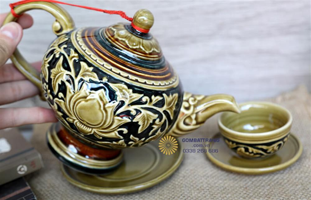 Bộ ấm chén Bát Tràng được chế tác từ gốm sứ cao cấp Bát Tràng, kết hợp kỹ thuật đắp nổi truyền thống