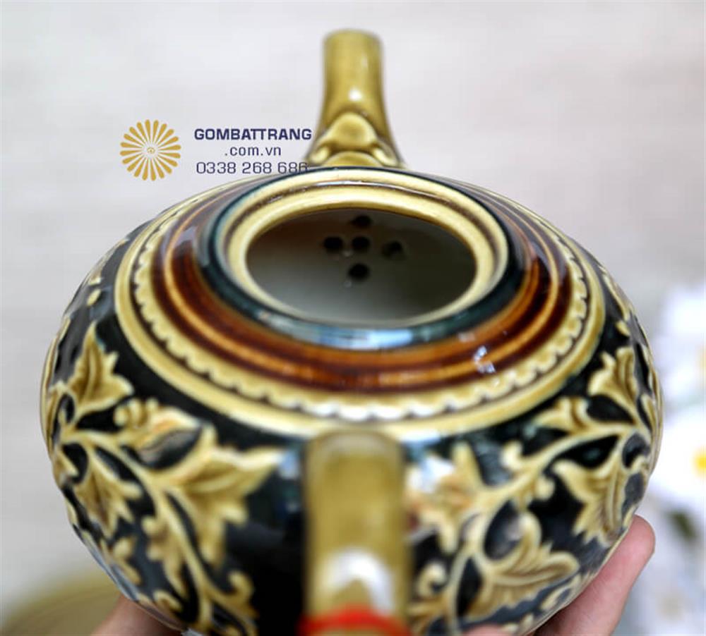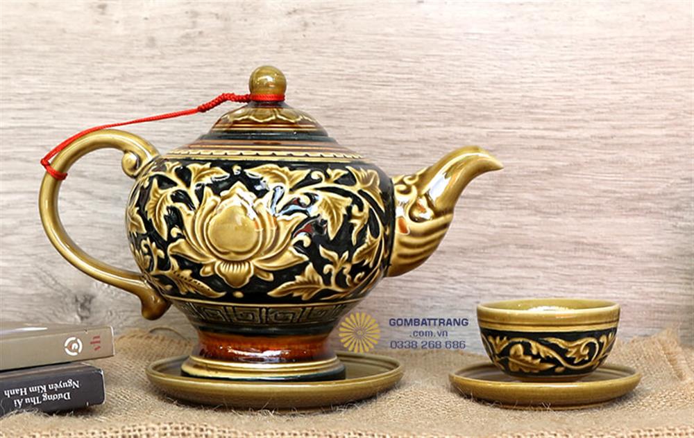Kỹ thuật đắp nổi truyền thống được nghệ nhân Bát Tràng thực hiện tỉ mỉ từng đường nét, tạo nên độ nổi rõ ràng cho họa tiết hoa sen.bộ ấm chén uống trà đạo