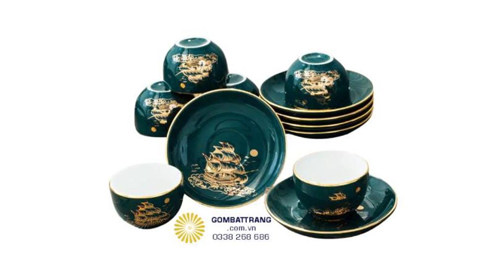 Trên thân chén biểu tượng Thuận Buồm Xuôi Gió tái hiện trở lại, tinh xảo và sắc nét, liên kết hoàn chỉnh giữa ấm chén uống trà đẹp – chén – đĩa. Chỉ có nghệ nhân kinh nghiệm mới vẽ được những đường vàng mảnh như tơ nhưng bền bỉ không phai sau nhiều năm.