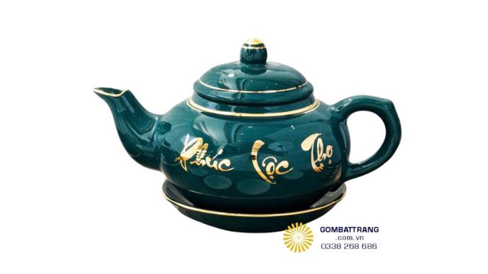 Điểm nhấn đặc biệt của bộ trà là chữ Phúc – Lộc – Thọ, vẽ thủ công bằng vàng 24k.