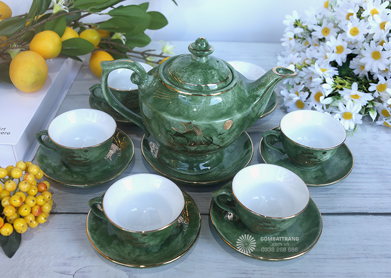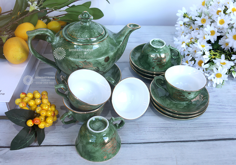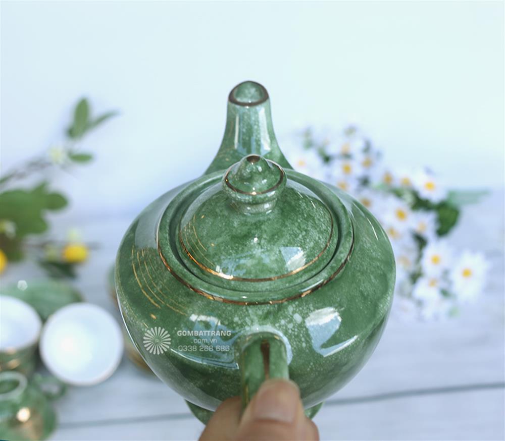Lớp men hỏa biến màu lục ngọc chính là điểm nhấn nghệ thuật cho bộ ấm trà Bát Tràng. Men được nung ở nhiệt độ cao, tạo hiệu ứng chuyển màu độc đáo, không trùng lặp ở bất kỳ sản phẩm nào. Đây là lý do khiến mỗi bộ ấm trà cao cấp bát tràng đều mang giá trị riêng, như một tác phẩm nghệ thuật sống động.bộ ấm trà Bát Tràng
