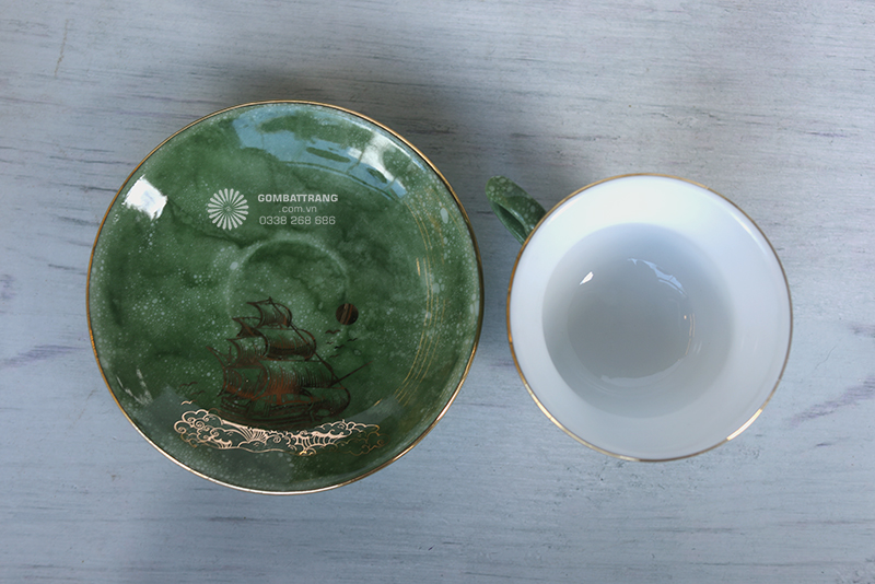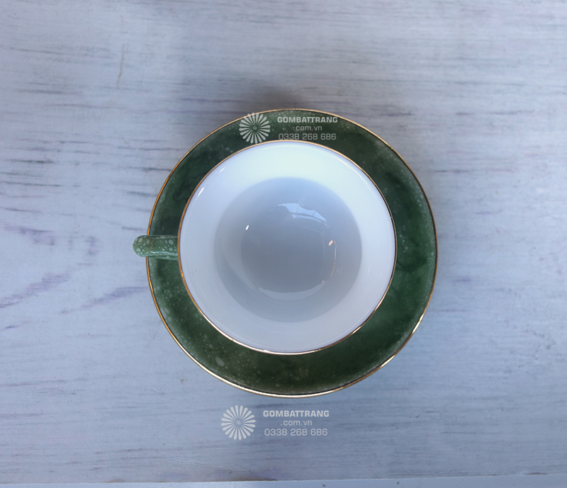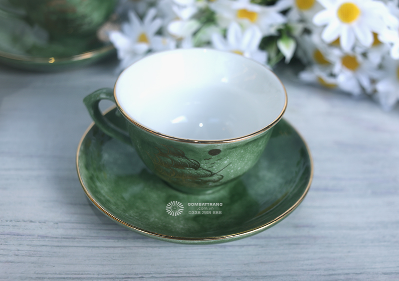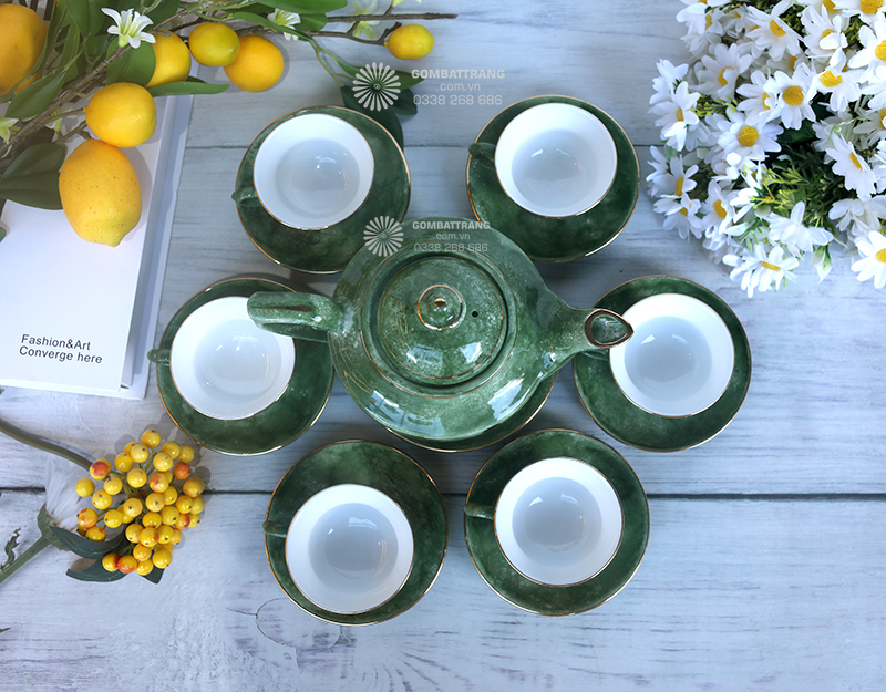 Chén trà trong bộ ấm trà Bát Tràng nhỏ gọn, lòng chén sâu giúp giữ nhiệt lâu và giữ trọn hương vị trà. Viền chén được dát vàng tỉ mỉ, hài hòa với lớp men màu lục, nâng tầm thẩm mỹ và tạo cảm giác quý phái khi thưởng trà.