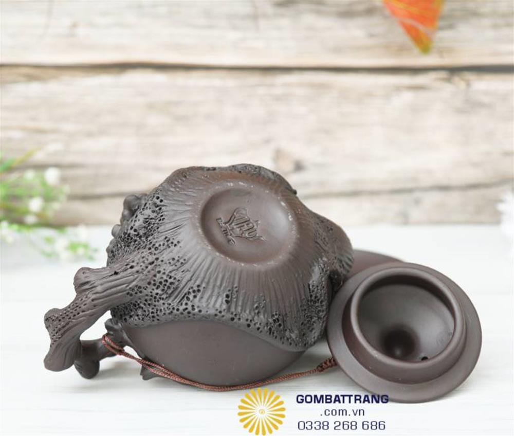 Lật nhẹ ấm lên thấy đáy được khắc rõ logo Gốm Bát Tràng – chứng nhận hàng chính hãng. Bề mặt đáy gốm mịn, phẳng, không vênh, khi gõ phát ra tiếng “ting” trong trẻo của gốm chuẩn.