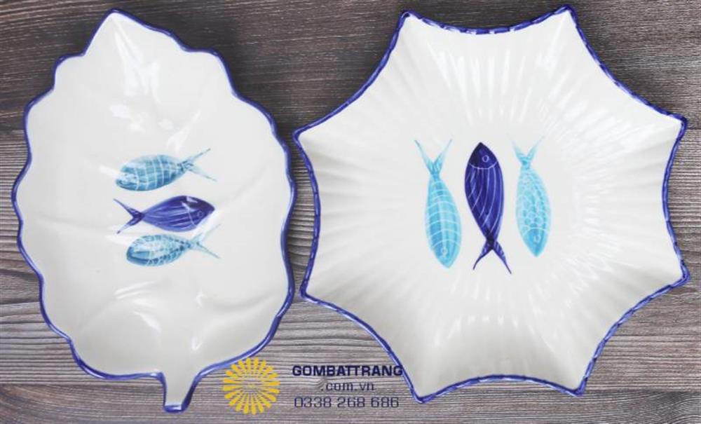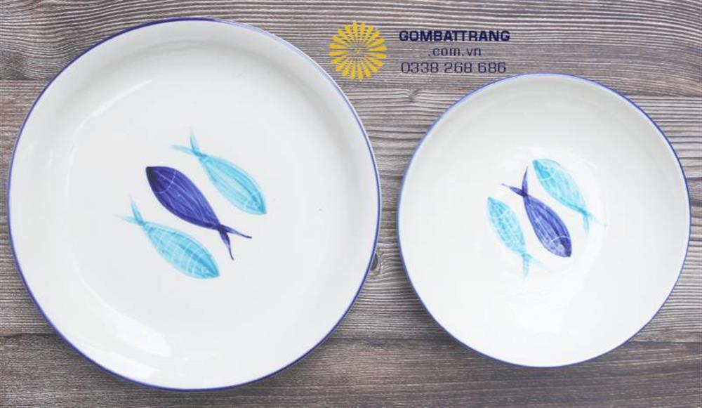 Bộ bát đĩa Bát Tràng 11 món gốm sứ cao cấp họa tiết cá xanh
