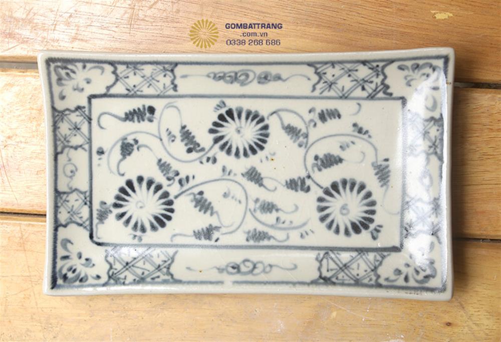 Chiếc khay chữ nhật nhỏ với viền bo cong nhẹ nhàng có họa tiết hoa cúc và hoa văn cổ điển được bố cục cân đối trên mặt khay, tạo sự thống nhất hoàn hảo với toàn bộ bộ bát đĩa Bát Tràng trong bộ sưu tập.Bộ bát đĩa Bát Tràng