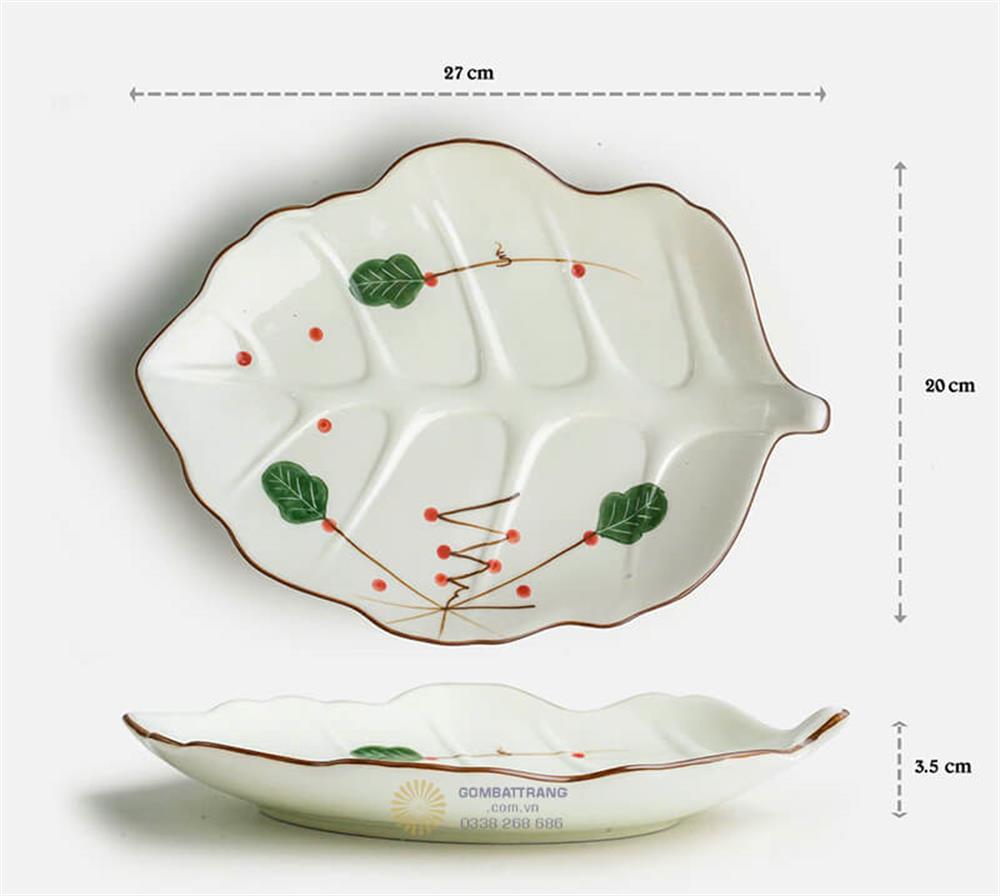 Những chiếc lá xương rồng màu xanh tươi mát được họa sĩ khéo léo tái hiện trên nền sứ trắng tinh khôi, kết hợp với những chấm hoa nhỏ màu đỏ cam rực rỡ, tạo nên vẻ đẹp tự nhiên và sinh động.