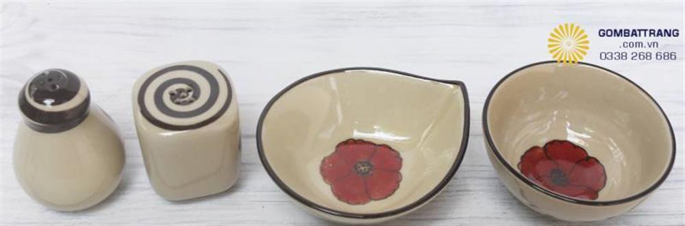 • Chén chấm, cốc và lọ gia vị – Những chiếc chén chấm nhỏ xinh, cốc uống nước và lọ gia vị đồng bộ không chỉ tiện dụng mà còn tăng tính thẩm mỹ cho bàn ăn. Dù nhỏ, mỗi chi tiết vẫn được vẽ hoa đỏ thủ công, làm nên sự đồng nhất và sang trọng cho toàn bộ set. bộ bát đĩa hoa đỏ Bát Tràng